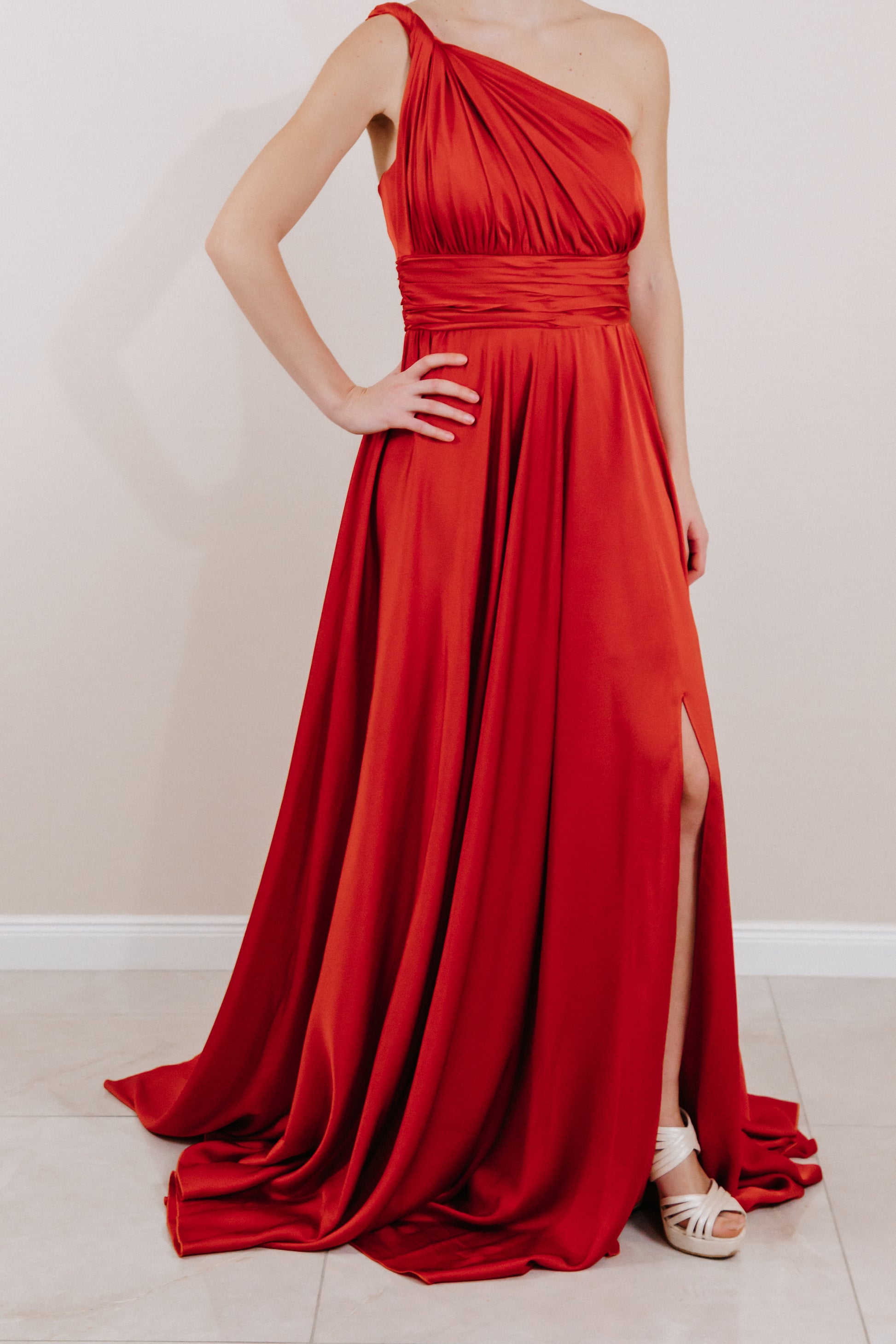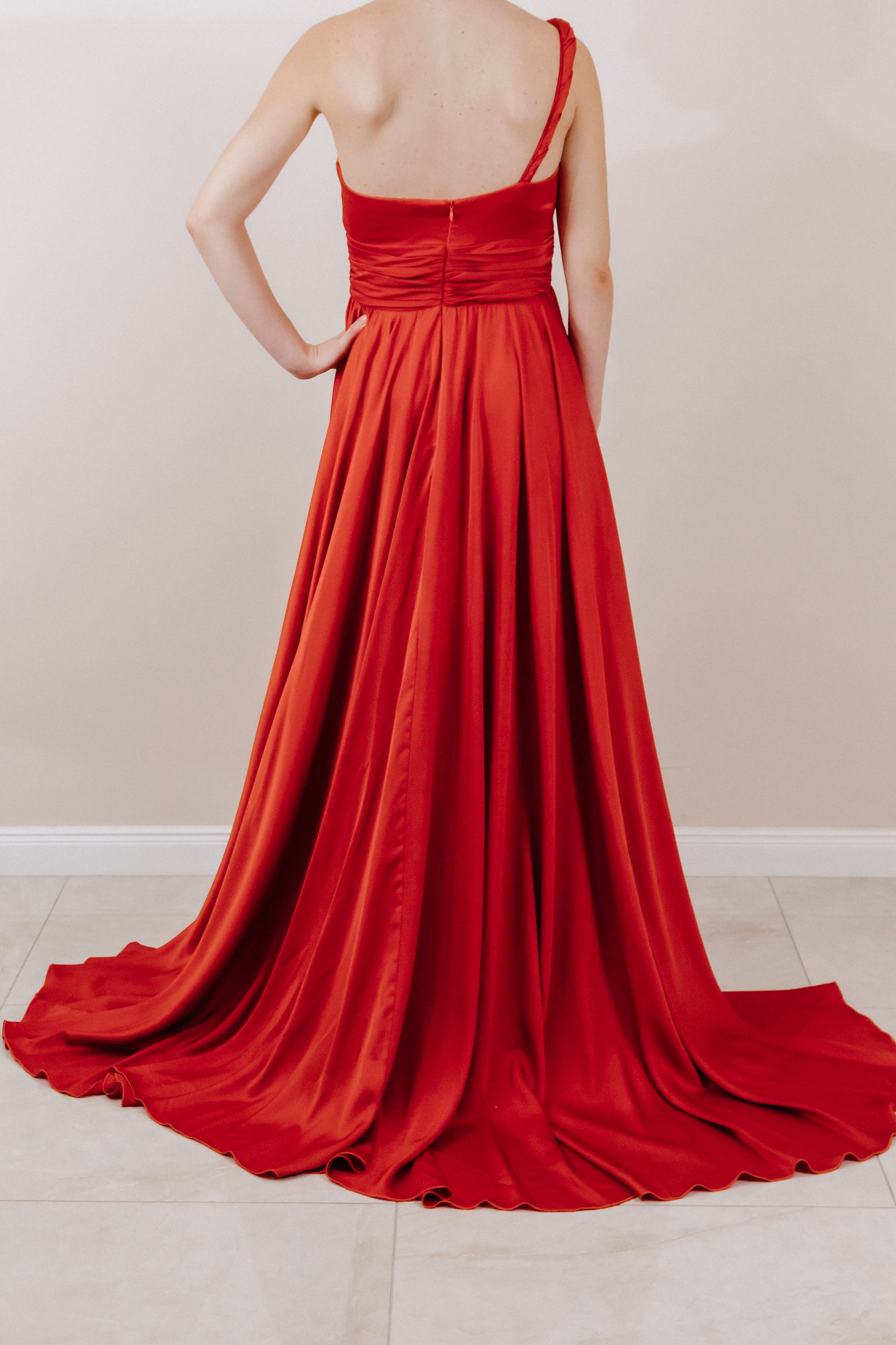 Setzen Sie ein Statement mit diesem ausdrucksstarken Abendkleid in einem intensiven Orange-Ton. Der fließende Stoff mit seidigem Glanz umspielt sanft die Silhouette und verleiht dem Kleid einen luxuriösen Fall. Die asymmetrische One-Shoulder-Form sorgt für eine moderne, feminine Ausstrahlung, während die dezente Raffung im Brust- und Taillenbereich die Figur vorteilhaft betont.