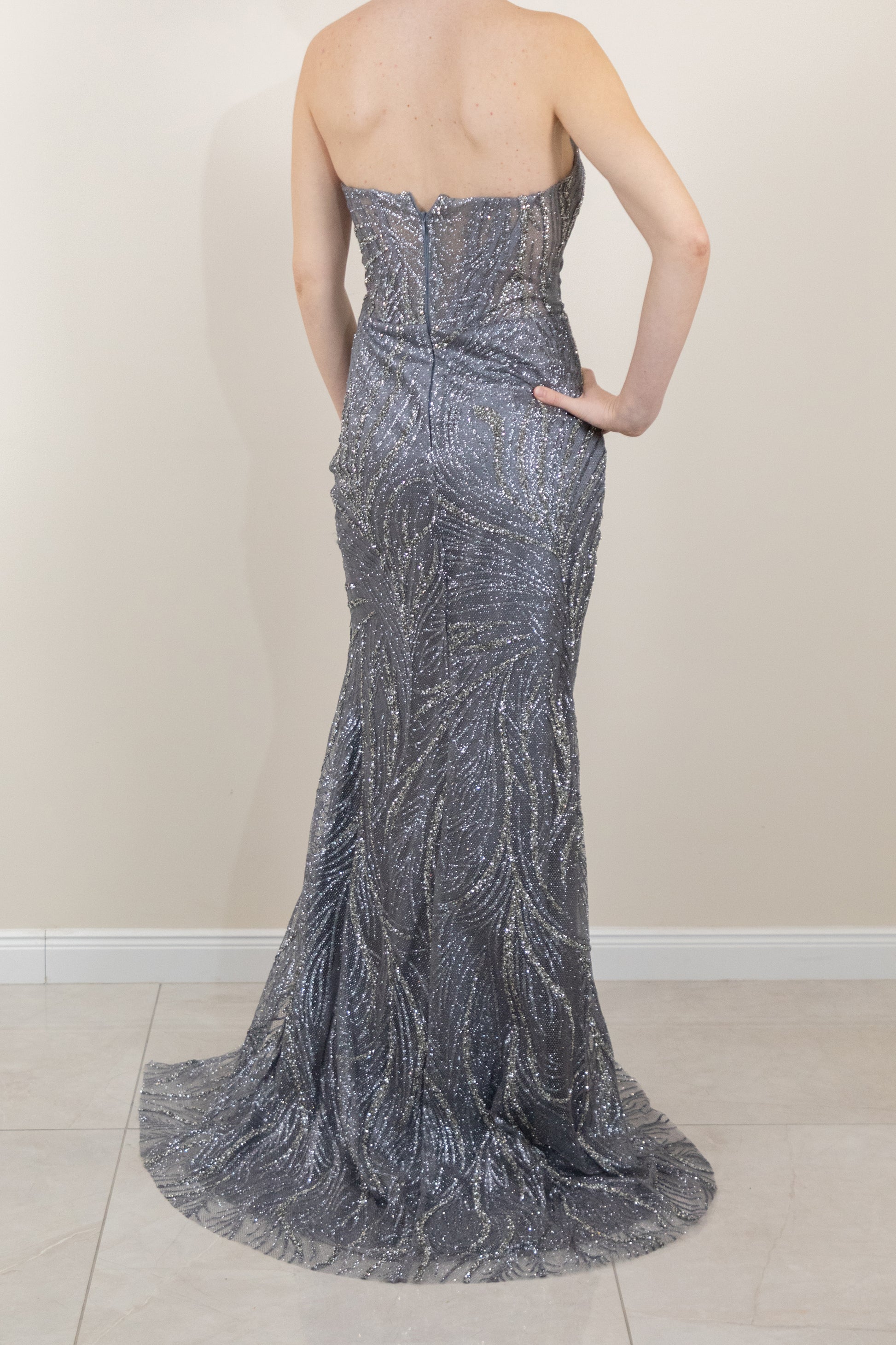 - Dieses elegante Abendkleid in einem edlen Grauton ist ein wahrer Blickfang für jede festliche Gelegenheit. Der figurbetonte Schnitt in Kombination mit einem geraden, trägerlosen Ausschnitt unterstreicht deine Silhouette auf stilvolle Weise. Die glitzernden Metallic Pailletten in geschwungenem Muster verleihen dem Kleid eine exklusive und glamouröse Ausstrahlung.